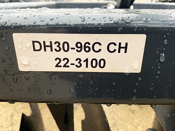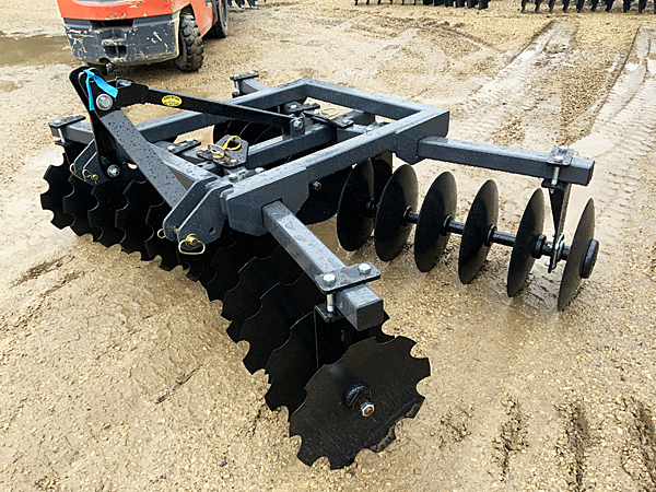 Description: New SC Midland DH30-96C-CH 96" MD series disk harrow, Cat I 3 pt. hitch, quick-hitch compatible, 18" notched blades on front and smooth blades on rear, 7 1/2" blade spacing, 1 1/8" square gang bolts, 3/8" thick bearing hangers with reinforcement, self-aligning sealed bearings, adjustable gang angle on both front & rear, 3" square tube frame, charcoal gray color. Includes factory freight and setup. Note: This disk harrow has been sold but please call for current price and availability of a new unit. 09/05/2025