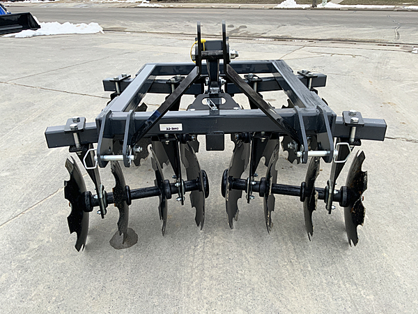 Description: New SC Midland DH30-60N-CH 60" disk harrow, Cat I 3 pt. hitch, quick hitch compatible, 18" notched blades on front and rear gangs, 7½" blade spacing, 1⅛" square gang bolts, self-aligning seal bearings, adjustable gang angle on both front and rear, 3" square tube frame, charcoal gray color. Can be used to fill in trenches from center pivot irrigation tires. Lists @ $3,410 includes factory freight and setup. We have two units in stock. 04/04/2023