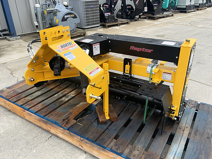 Description: New Nortec compact tractor Raptor NE-350000C 5-foot Cat I hydraulic angle soil processor, 540 PTO, quick hitch compatible, requires 15-35 hp, rear castering adjustable gauge wheels, weighs 625 lbs., 4-foot and 6-foot models also available. Manual angle also available in lieu of hydraulic angle.
