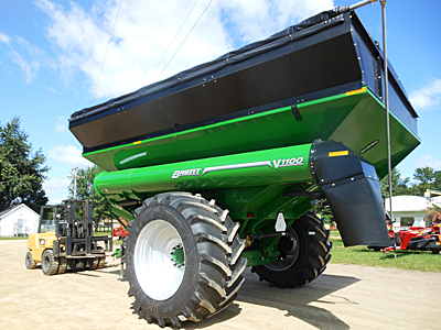 New Brent V1100 1100+ bushels grain cart, 20" corner-auger, UHarvest PRO ISOBUS scale system 5-point load cells, factory roll tarp, 1¾" 1000 PTO (1⅜ 1000 PTO available). Goodyear DT930 LSW 1100/45R46 RIW tires (ground pressure with DT930 tire is 14.76 PSI), adjustable axle. Optional: Remote display kit with 4" X 18" LED display and 40-foot cable. Lists @ $118,210 plus freight & setup.
