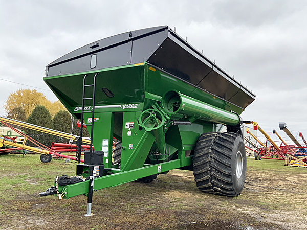 New Brent V1300 corner auger grain cart, 1,300+ bushel capacity, standard 20" unload auger, 4-way downspout, 1¾" 20 spline cut-out clutch PTO, transport chain, Weatherguard roll tarp, single tang hitch bar with reducer bushings, Firestone IF1250/50X32 R1W tires (201A8 L1), 16.24 PSI ground pressure, UHarvest PRO ISOBUS scale system 5-point load cells, remote 4" x 18" display kit, green color. Lists @ $133,900 plus freight & setup.