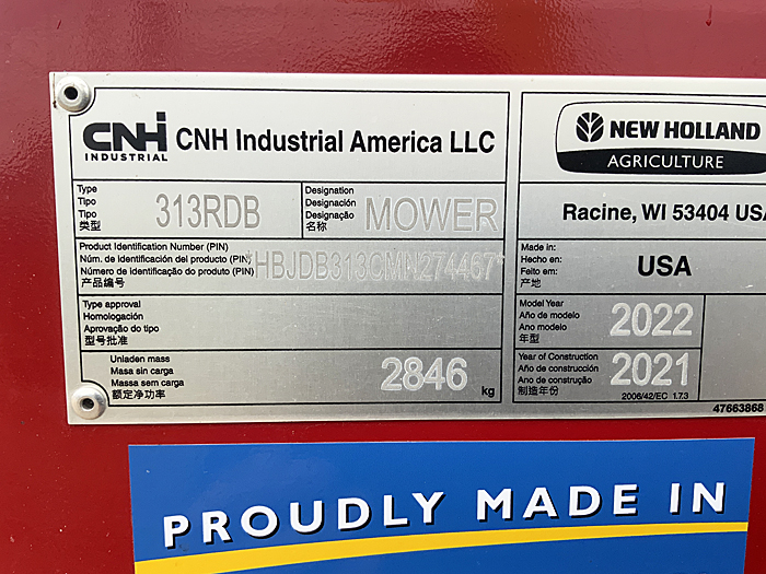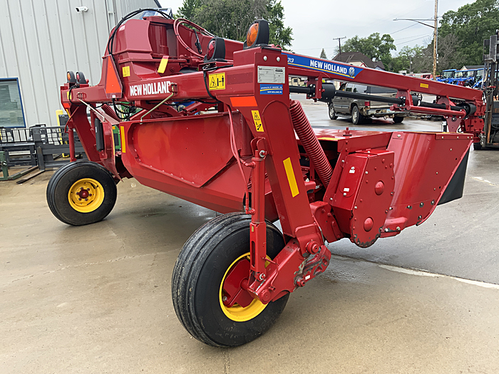 Description: 2022 New Holland 313R 13-foot discbine mower conditioner with rubber conditioner rolls, drawbar swivel hitch, transport lights, quick-change knives (new knives just installed), 1⅜" 21-spline 1,000 PTO. Serviced through our shop. One owner. Low acres, in like new condition.