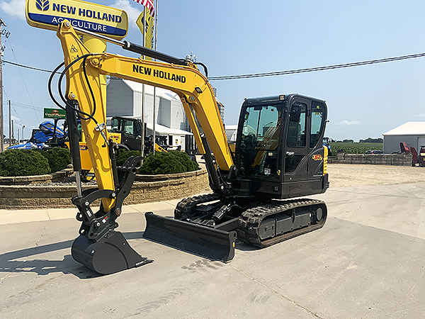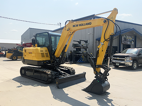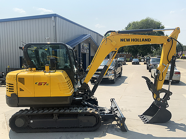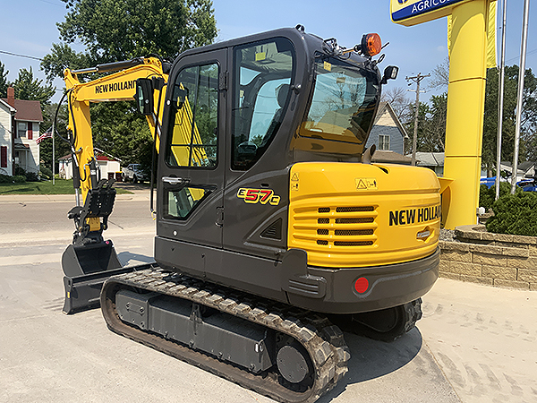 Description: New New Holland E57C compact excavator, enclosed cab with AC/heat/radio and USB, Yanmar Tier 4 Final Diesel engine, two speed (speed 1 = 1.3 mph, speed 2 = 2.5 mph), overall height 8' 4", two-way auxiliary joystick, 4 way angle dozer blade, rubber tracks, work lights & beacon, counterweight/linkage with hook. Includes hydraulic thumb kit and long tines and a 24" bucket. Maximum dig radius 20' 2", maximum dig depth 12' 6".