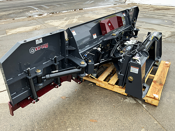 Description: New Virnig HSBP120 V60 120" hydraulic snow blade/pusher. Electric over hydraulic control allows independent angling of each wing, three blade sections with individual bottom trip edges utlizing eight total compression springs. Side to side oscillation & adjustable cast skid shoes. Floating frame link maintains full blade contact when wings are angled (also allows down pressure when the wings are straight). Includes ELC14 14-pin control for New Holland/Case/Kubota/JCB ++ others, 5/8" X 8" bolt-on cutting edge, 31" blade height. Weighs 1,540 lbs. Recommended loader capacity of 1,800 lbs. or greater. Lists @ $12,475, plus freight & setup. We have two one unit in stock. 11/14/2022