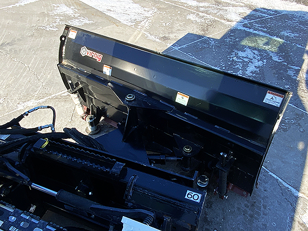 Description: New Virnig SBS60-LD V50 60" angle snow blade, 4" side-to-side oscillation, pin-adjustable dish-style skid shoes, double spring trip edge has 5/8" X 8" bolt-on cutting edge, hydraulic angle 30 degrees left or right, weighs 815 lbs. Lists @ $4,830.
