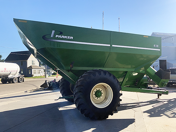 Description: Used Parker 838 850-bushel capacity grain cart, PTO-driven auger, hydraulic front-fold auger, hydraulic rear gate, 1,000 RPM PTO (choice of 1⅜" 21-spline or 1¾ 20-spline yoke), Firestone 30.5L-32 R1 traction tires, rear hitch kit, transport lights and safety tow chain. Good flighting (new lower 18" diameter main flight was just installed). Serviced through our shop.