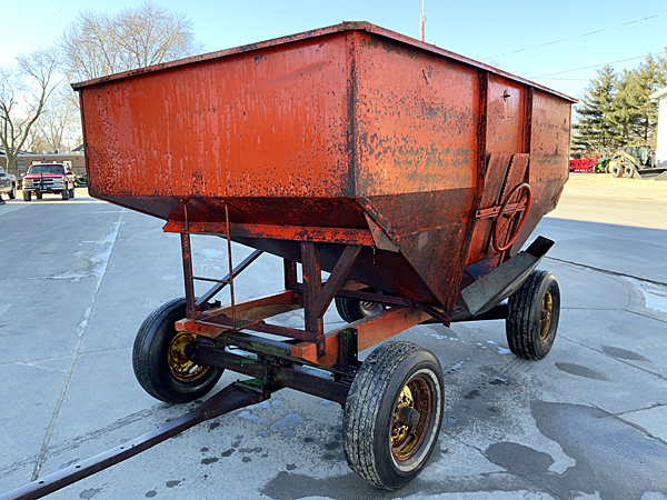 Description: Used 200+ bushel gravity box on John Deere wagon running gear. Needs two front tires; both rear tires are very good. Box is very clean (never used for fertilizer).