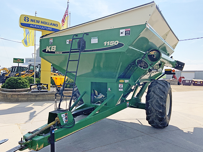 Description: Used 2012 Killbros 1150 14" corner auger grain cart, 500-plus bushel capacity, very good original flighting, 120" rigid axle, Goodyear 23.1X26 R1 tires, roll tarp kit, 1,000 RPM PTO, transport light. Very clean, straight grain cart.