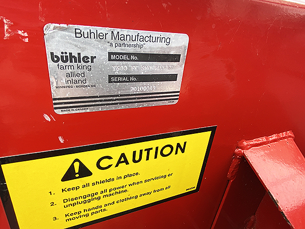 Description: Buhler Farm King 500 60" 3 pt. 2-stage snowblower, 540 PTO, manual hand crank chute control.